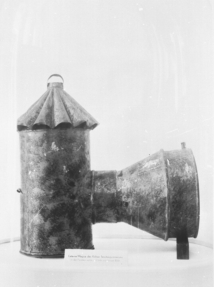 | Beschreibung | Eine Laterna Magica ist ein Vorläufer des heutigen Diaprojektors. Sie wurde benutzt, um auf Glas oder Pergamentfolie gemalte (farbige) Bilder an die Wand zu projizieren. Als Lichtquelle diente eine Öllampe oder Kerze, die durch eine Kondensorlinse verstärkt wurde. Das Licht befand sich in dem zylindrischen Behältnis mit Dach. Im Kölner Kolleg wurden neben Papierbildern auch Scherben von ehemaligen Kirchenfenstern zur Projektion benutzt. Zwei auf Pergamentfolie gemalte Darstellungen (Christus als Auferstandener, Löwenmaske) stammen wohl aus dem alten Bestand der Jesuitensammlung. |