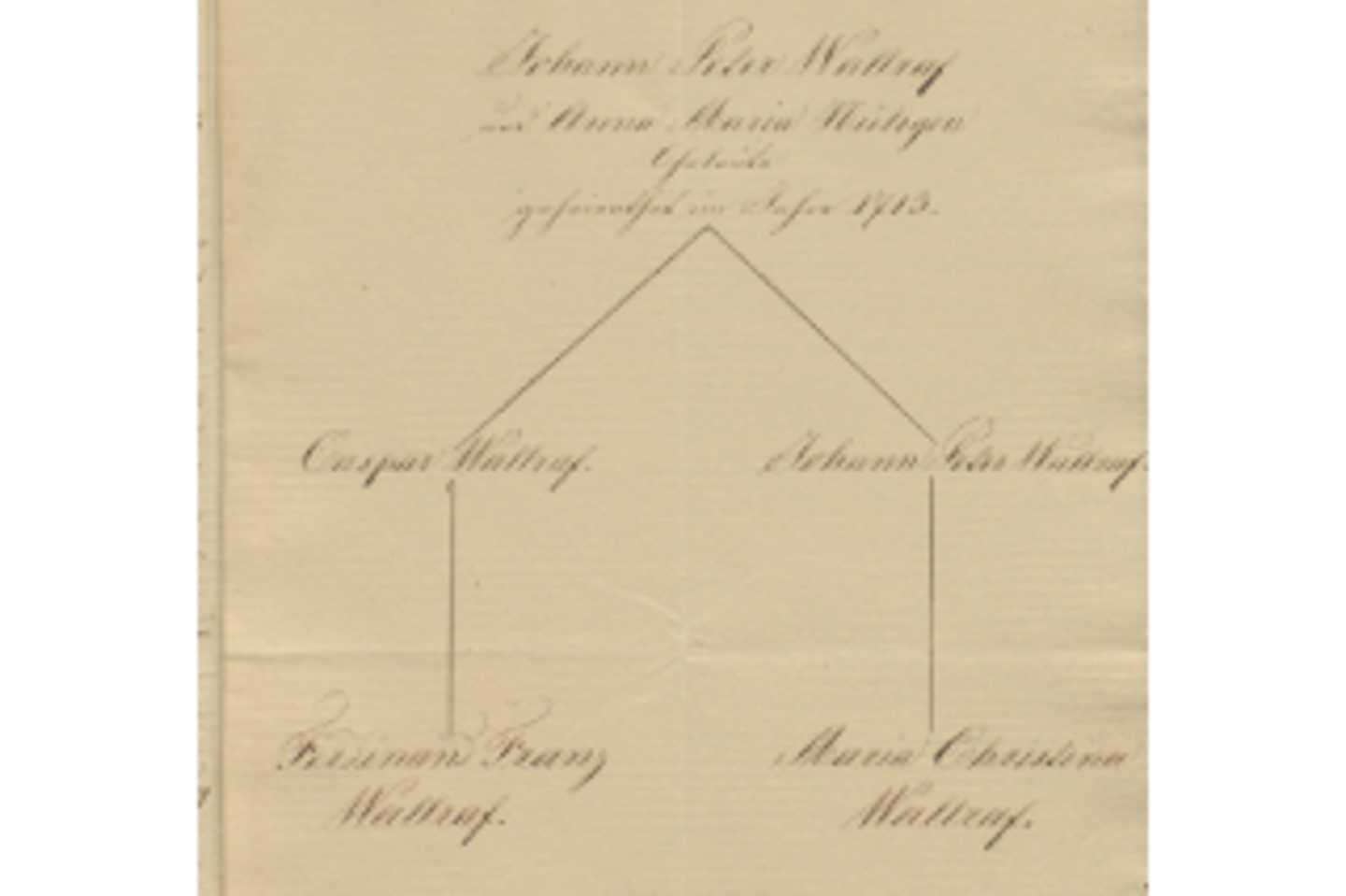 Bereits kurz nach Inkrafttreten des Testaments versuchten auch andere Verwandte von Wallrafs Vermächtnis zu profitieren. Max Falcke, Schreiber, richtete ab August 1824 diverse Bittschreiben[24] an den Oberbürgermeister, um eine Anstellung zu erhalten. Dabei brachte er auch seine verwandtschaftlichen Beziehungen zu Wallraf ins Spiel und legte gar einen vereinfachten Stammbaum[25] bei, der belegen sollte, dass seine Schwiegermutter, Maria Christina Wallraf, eine Cousine des verstorbenen Professors gewesen sei. Am 9. August 1824 führte der gut informierte Falcke aus: „Der verstorbene Professor Herrn Wallraf hat zwar ein Grad nähere Verwandten als meine Schwiegermutter, nemlich Schwesters Kinder hinterlaßen, denen ein jährliches Einkommen zugesichert ist; und weil des hochverdienten Oheimslinie dieses Glück nicht zu Theil geworden, so hoffe ich mit ganzer Zuversicht, daß Euer Wohlgeboren mir etwas Verdienst zukommen laßen werden […]."[26] Bis in den September 1826 war keine von Falckes Schriften erfolgreich.